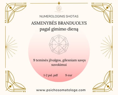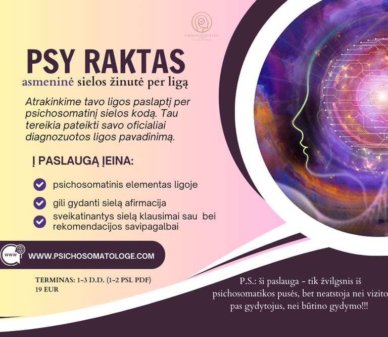 „PSY RAKTAS – tai asmeninė sielos žinutė per ligą“ Tai tavo galimybė pažvelgti giliau į savo diagnozę. Aš padėsiu tau suprasti, ką tavo kūnas bando pasakyti per ligą – per psichosomatikos kalbą. Ši paslauga - tarsi rašytinė mini konsultacija.